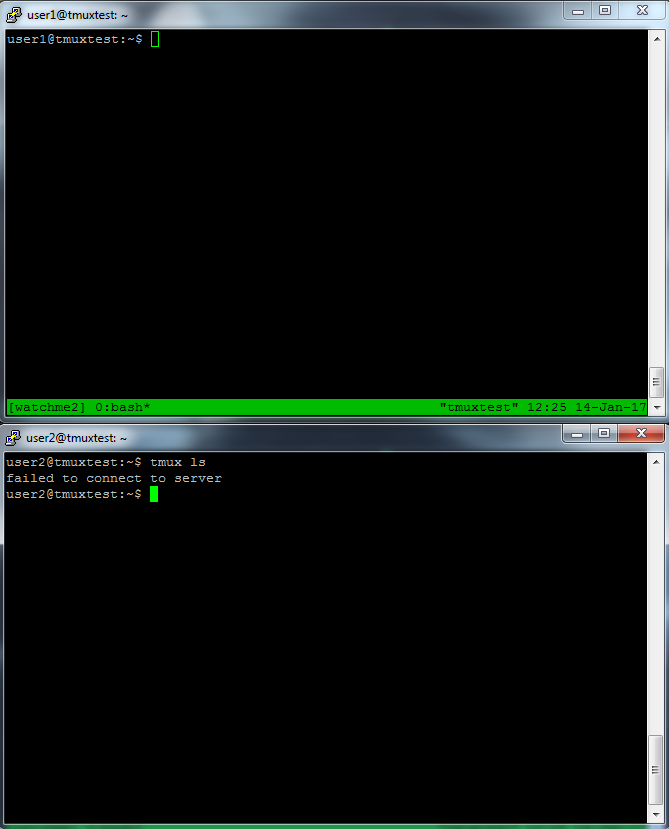 Ok – so now for the terminal sharing.  We know how to create a session and how to attach and detach from them.  Surprisingly, that’s all we need to know to share a session between two users using the same account.  For instance, let’s have two users log into the server both using the ‘user’ account. We’ll have the first user create a session called ‘watchme’ with the command ‘tmux new -s watchme’.  Now if we have another person log in to the same server, with the same user account, they can see that session by using ‘tmux ls’…