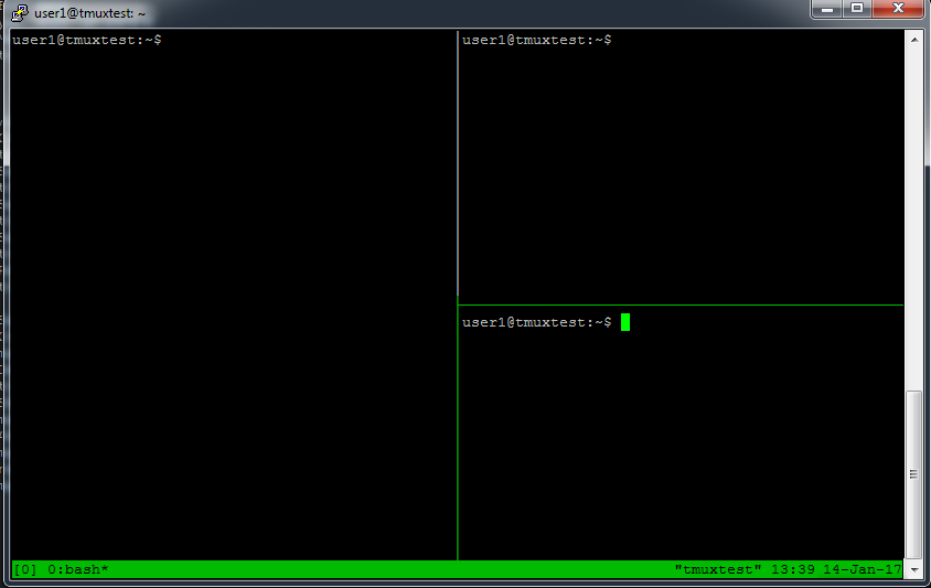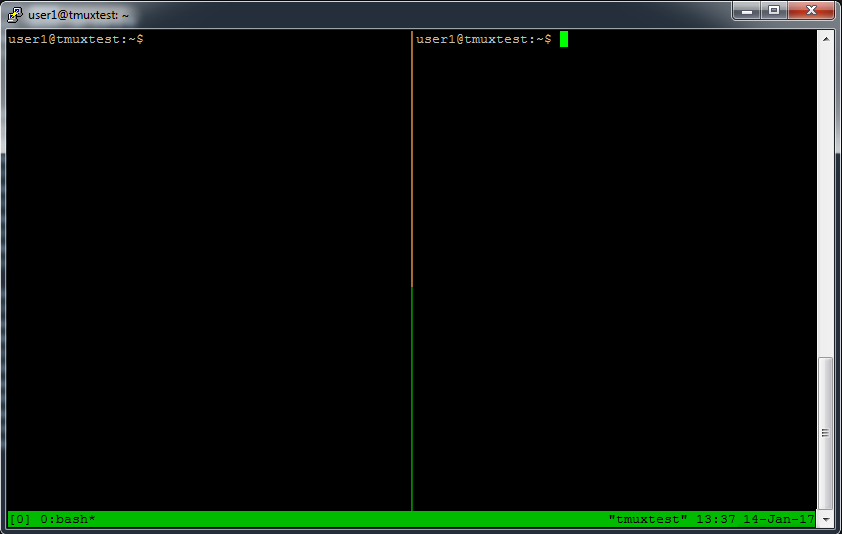 Notice that the screen on the right, the new one, has a green boarder around it.  That’s my active screen.  Now if I want to split this screen horizontally I can use ‘Ctrl-b + “‘…