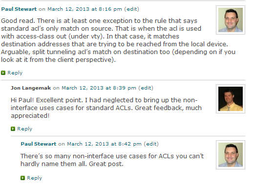 I’ll admit, there were times over the last 3+ years where I neglected the blog entirely.  Stuff happens, but I think you’ll find that once you start blogging, and really get involved, it becomes an addiction.  I love blogging now.  Why?  Because I’m involved in the community.  Here’s an example.  I posted an article on how to configure standard and extended ACLs based on my CCIE studies.   Within hours of posting I get a comment from Paul Stewart  (@packetu) over at Packet University…