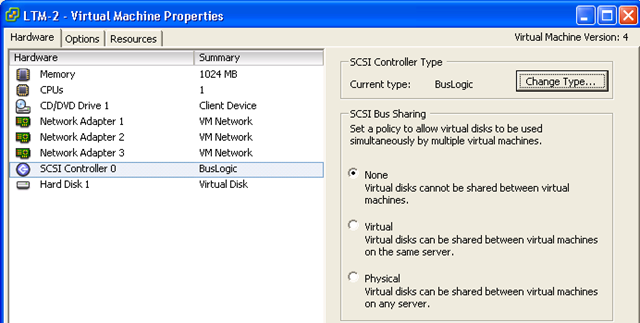 8 – In the setting window select the SCSI Controller object on the left, and then click the ‘Change Type’ button on the right hand side of the screen.