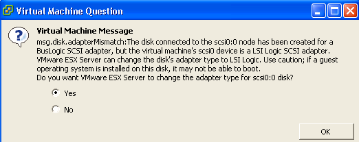 10 – OK your way out of the open windows and fire up the guest machine. When you start the guest machine you will get a warning about changing the disk controller. Select ‘Yes’ and hit OK to boot the guest.