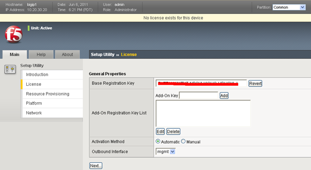 Once you are logged in, you’ll need to license the box using the activation key that you received when you registered to download the VE LTM. Upon login, the device will ask you to start a setup wizard. Click ‘Next’ to start the setup utility. On the next screen click ‘Activate’ to enter the licensing window. Copy the registration key from you email to the ‘Base Registration Key’ area on the screen and press the ‘Next’ button.
