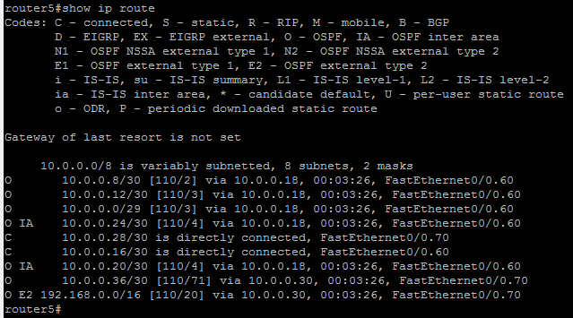 We can see that we have a problem. Area 1 is not connected to the backbone area. Surprisingly, the router’s don’t appear to be complaining about their new configuration, but there are some rather apparent issues. For instance, router5 is not redistributing any of it’s area 1 routes into area 2.