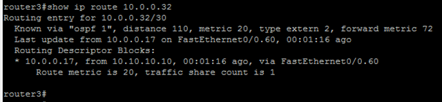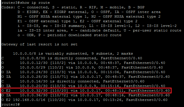 As you can see, 10.0.0.36/30 is gone, but the 10.0.0.32/30 (type 5) route is still present. The important fact to remember about filtering in this manner is that the LSA itself is prevented from being sent into area 0. If we look at router2…