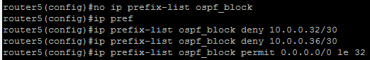 A simple prefix list to deny the prefix we are trying to block followed be an ‘any’ entry will allow all of the other routes to still come in. Taking a look at the routing table on router5, we see that the prefix is now gone…