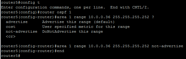 The ‘range’ command is used to tell the ABR to summarize all smaller networks and just advertise the one larger summary. Tacking on the ‘not-advertise’ command allows you to tell the router to not only cease advertising the smaller prefixes, but the summary as well.