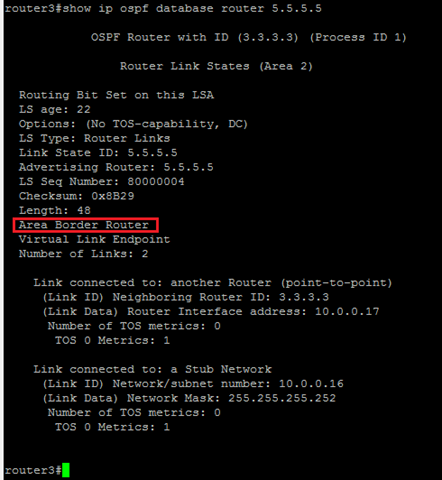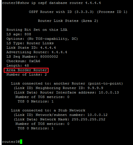 If we look at the router LSAs on router3, we can see that it thinks router4 is an ABR…