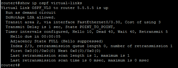 After that’s configured, the virtual link loads. We can examine the virtual link by executing the following show command…
