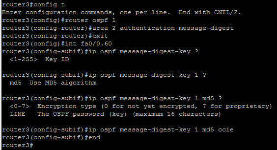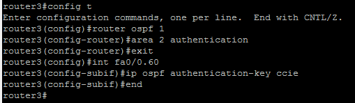 On router 3, we configure the auth ‘type’ on the router process and the key on the interface…
