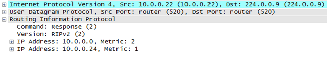 Keep in mind, that this really only applies to the ‘winning’ route here. RIP uses the hop count as the metric and considers 16 to be ‘infinite’. That is, a router that is 16 hops away wont be considered by RIP. So in this case, router4’s best path to 10.0.0.24/30 is through router2 which implies that it heard the update from router2. We can confirm that by looking at the communication between router2 and router4…