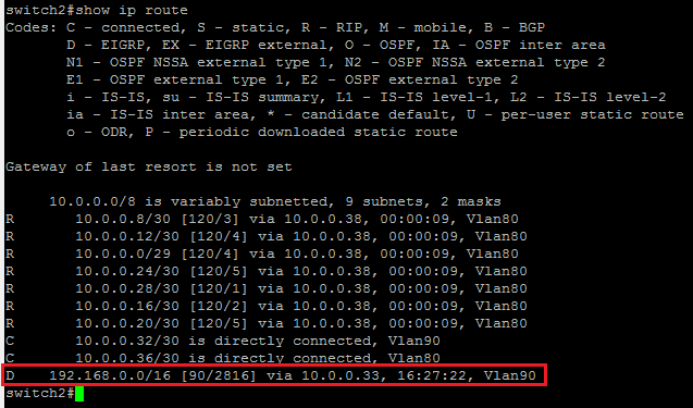 Let’s take a look at redistributing out 192.168.0.0/16 prefix from switch3 into RIP on switch2. Recall that switch2 and 3 area talking EIGRP. That being said, we want to redistribute EIGRP into RIP. Let’s give that a try on switch2 and see what happens…